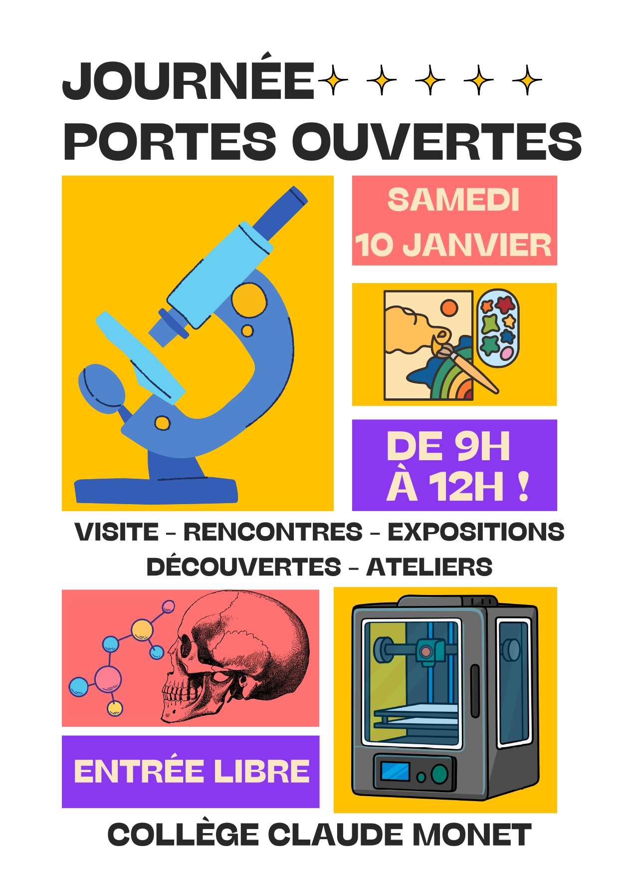 Madame, Monsieur, Nous avons le plaisir de vous inviter à la Journée Portes Ouvertes qui se tiendra au collège Claude Monet le samedi 10 janvier 2026 de 9h à 12h. Cette journée sera l’occasion pour vous de découvrir notre établissement, d’échanger (...)